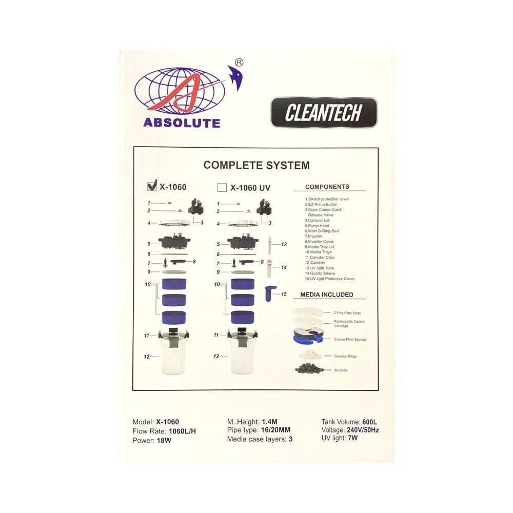 Cleantech Canister Filter X-1060 by ABSOLUTE is quiet and reliable. It works beautifully on aquariums up to 350L. With a flow rate of 1060L/H and 3 media baskets this filter is easy to maintain and suitable for both fresh and salt water. Comes with everything needed to maintain beneficial bacteria – Bio Balls, Ceramic Rings, Filter sponges both coarse and fine plus replaceable carbon sponges.